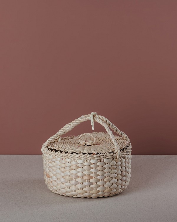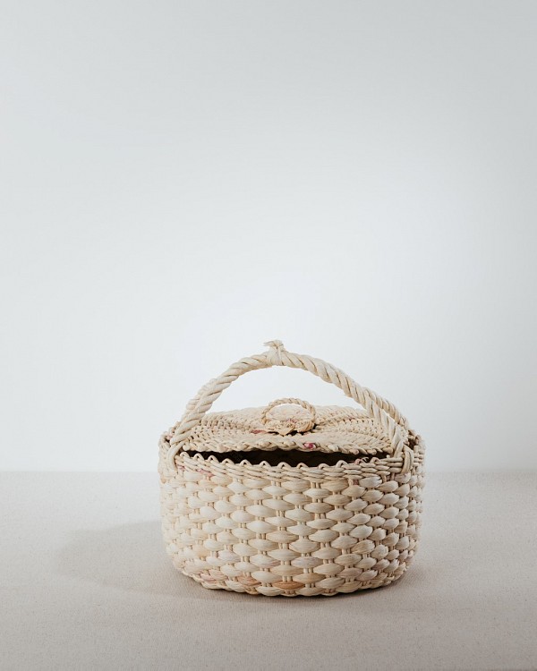 A round tote bag, woven from traditionally processed husk in the technique of our ancestors.